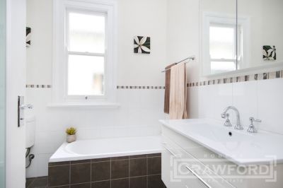 With typical side entry or enter direct from the covered front veranda to the charming formal lounge room with original brick fireplace and timber floors, THREE generous bedrooms, all with built-in robes and Plantation Shutters, stunning new bathroom with a bath tub + Tall shower recess with frameless glass screen, custom designed kitchen featuring Westinghouse stainless steel gas cook top, electric oven, rangehood & dishwasher, Caesarstone benches & tiled splashbacks.