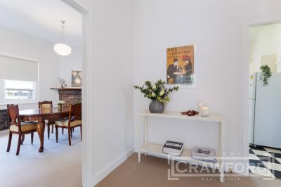 The large covered semi-circular verandah opens to a wide entry hallway leading to two well-proportioned bedrooms, a central bathroom, spacious living and dining room, an updated eat-in kitchen with dishwasher, light drenched sunroom and an enclosed verandah leading to the laundry and WC.